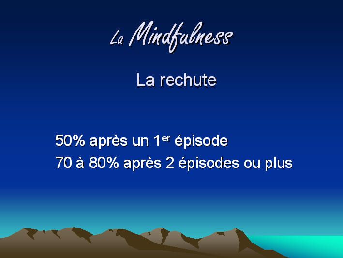 La méditation permet particulièrement de se centrer sur le moment présent, en évitant le processus de rumination de pensées négatives et de se laisser entraîner dans une "spirale infernale"